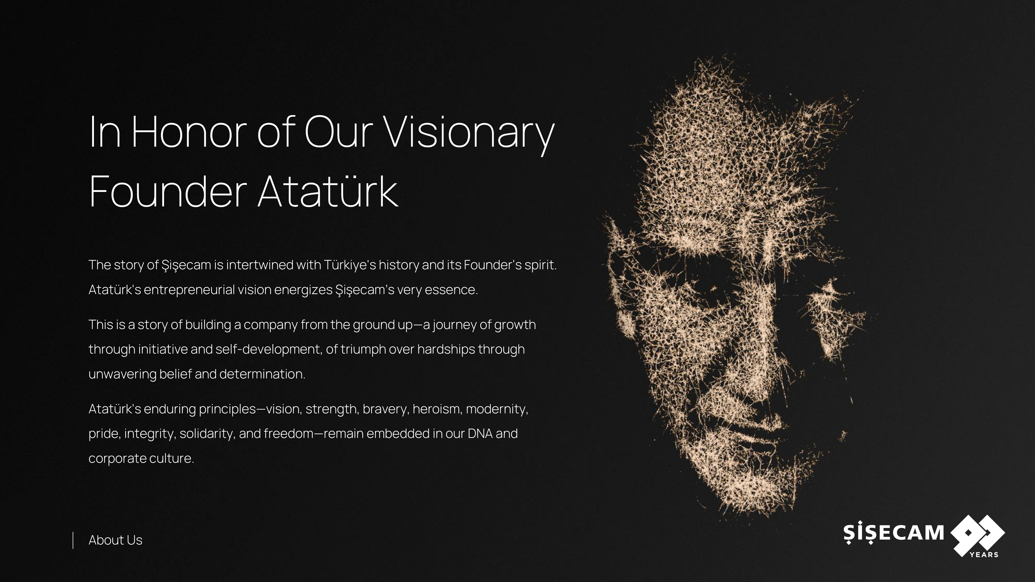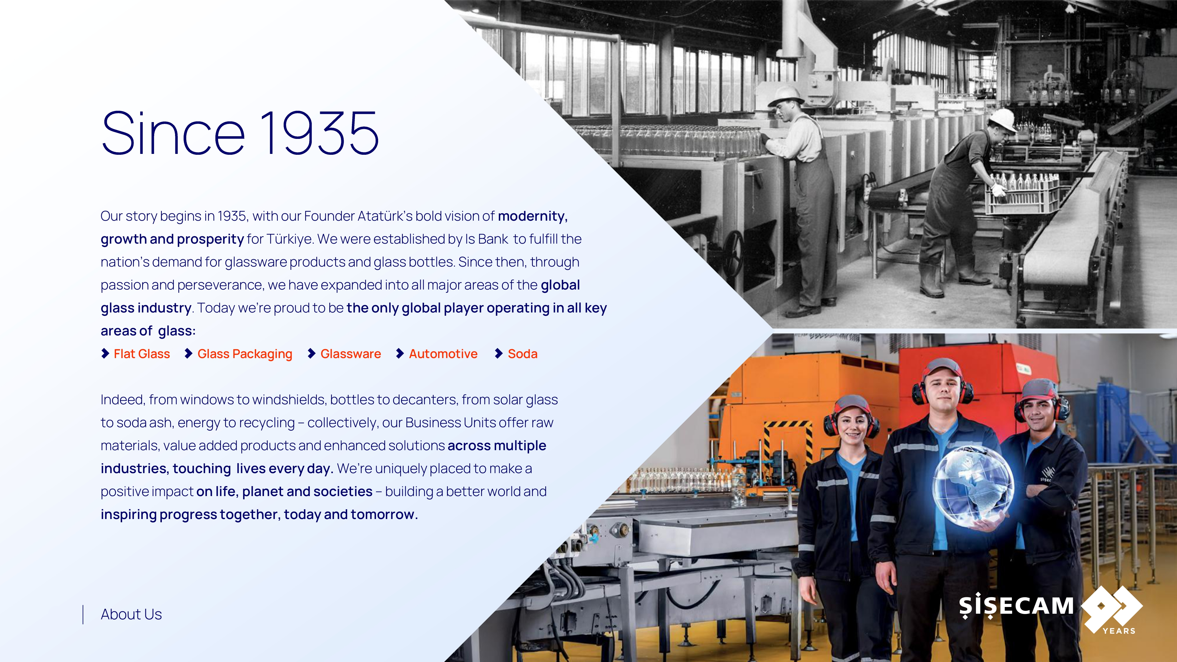1935 yılında genç Türkiye Cumhuriyeti'nin sanayi gelişimine katkı sağlamak üzere Türkiye İş Bankası tarafından Türkiye'nin cam sanayisini inşa etmek amacıyla kurulduk. Yerel bir girişim olarak başladığımız gelişim yolculuğumuzda yıllar içinde cam ve kimyasallar sektörlerinde küresel bir oyuncuya dönüştük.