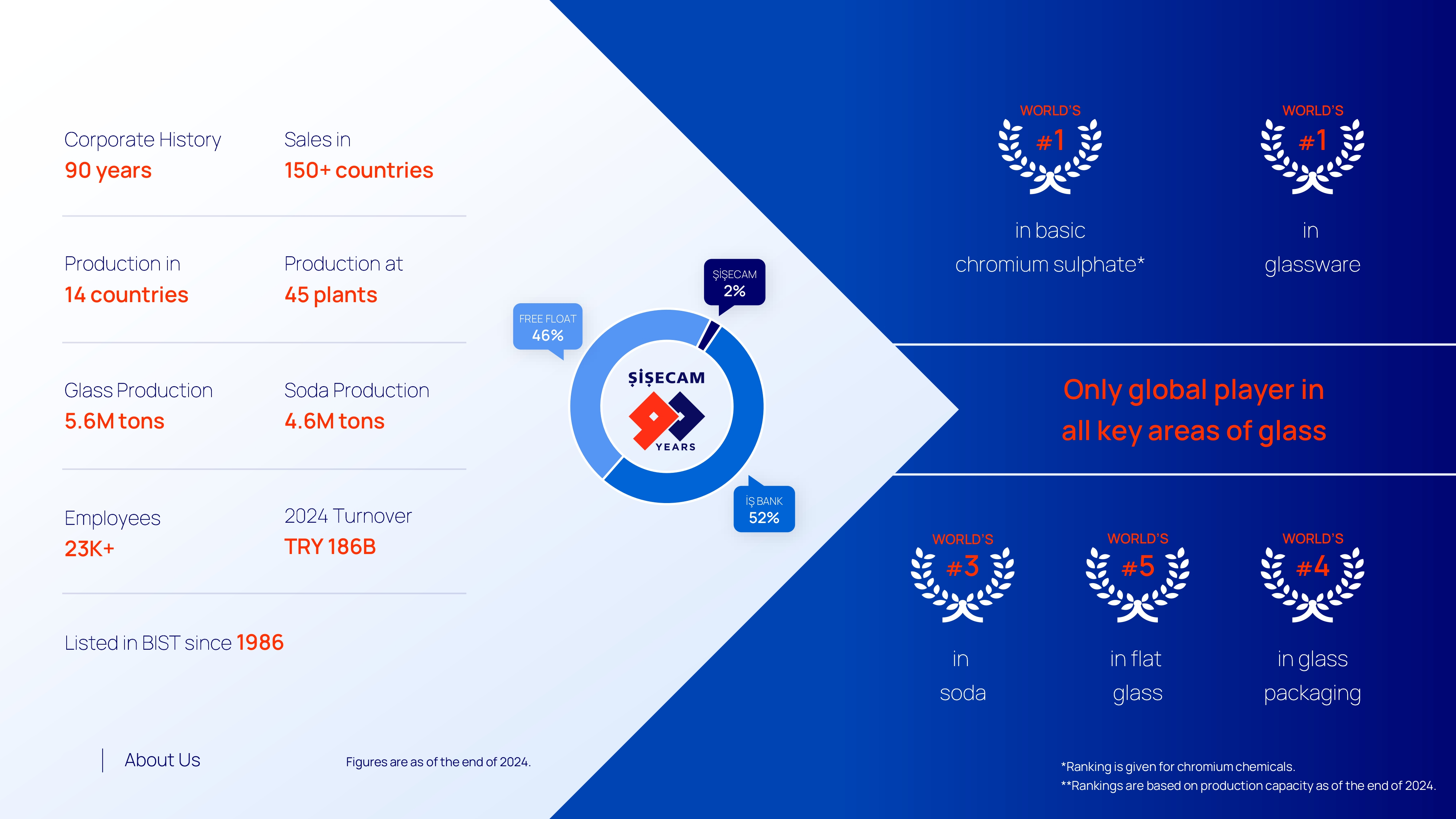 Camın tüm temel alanlarında faaliyet gösteren tek global şirket olarak, sektörlerimizde dünyanın en büyük beş üreticisinden biriyiz.