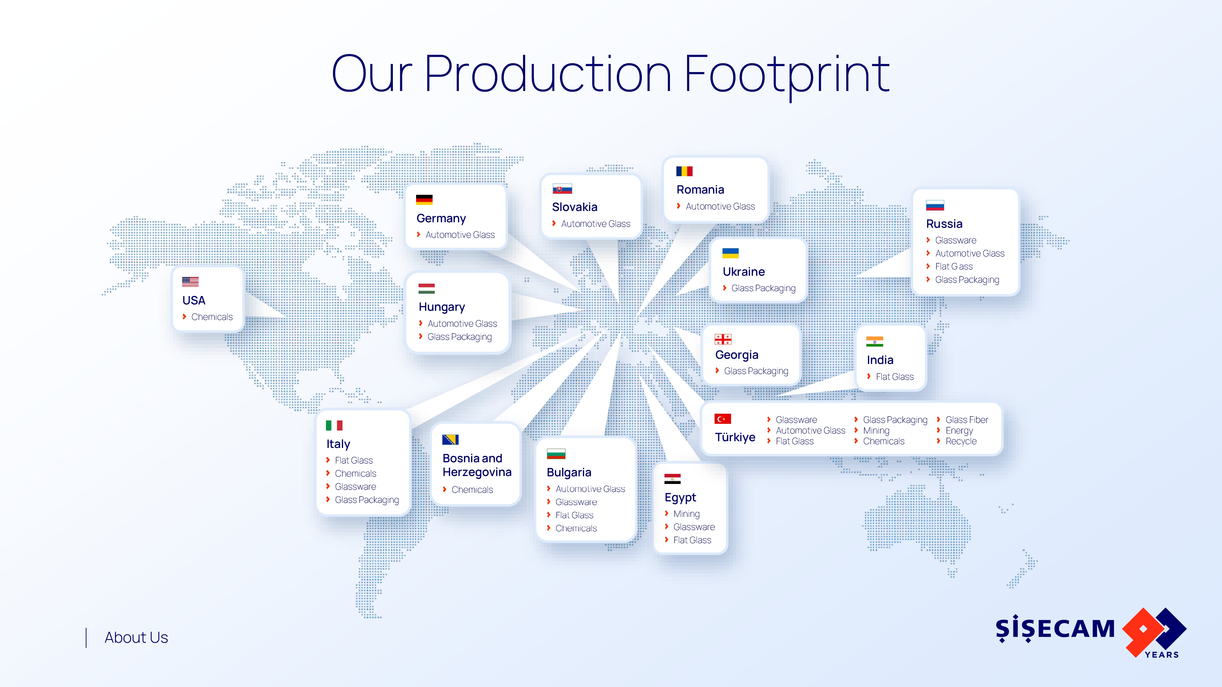 Türkiye, İtalya, Bulgaristan, Romanya, Slovakya, Macaristan, Bosna-Hersek, Rusya, Gürcistan, Mısır, Hindistan ve ABD dahil olmak üzere dört kıtada, 12 ülkede üretim yapıyoruz. Düz cam, cam ev eşyası, cam ambalaj, kimyasallar, otomotiv, cam elyaf, madencilik, enerji ve geri dönüşüm sektörlerinde öncü bir rol oynuyoruz. İnovasyon ve teknolojiyi işimizin merkezinde tutarak yetkin tedarik zincirimiz sayesinde ürünlerimizi 150'den fazla ülkede müşterilerimizle buluşturuyoruz.